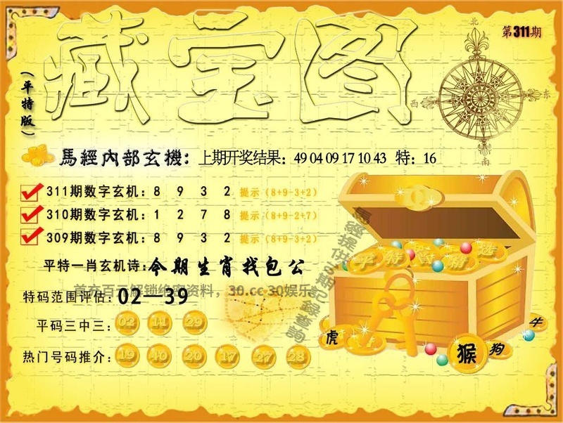311期:平特藏宝玄机:【今期生肖找包公】 特码范围评估:02-39 |