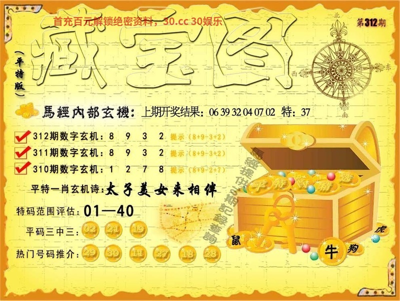 310期:平特藏宝玄机:【今期生肖在北边】 特码范围评估:01-40 推荐平码:29.30.10.27.37.38 |